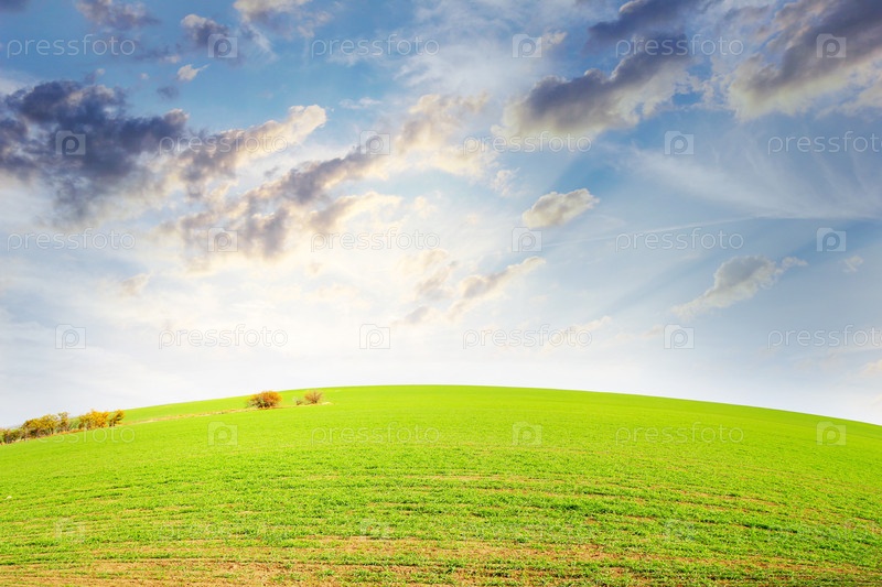 Красивая зеленая трава на поле и небо с облаками