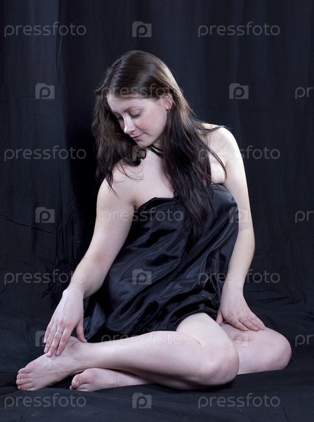 Молодая красивая женщина сидит в черном платье на черном фоне