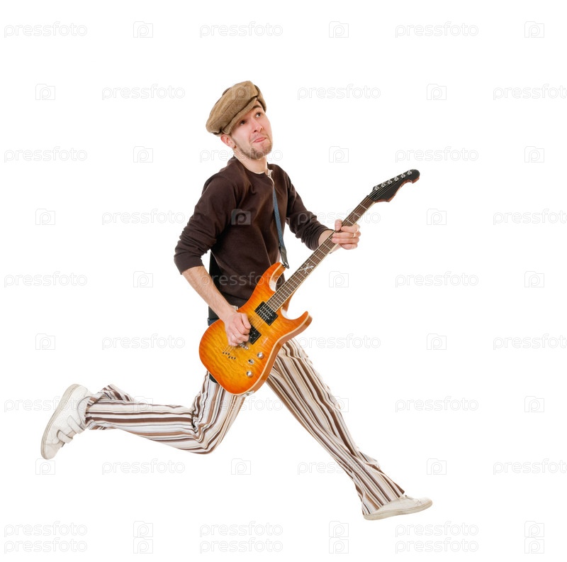 Музыкант с гитарой на белом фоне
