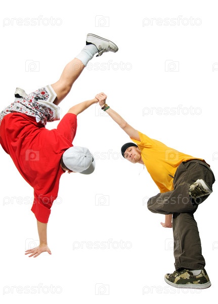 Молодые люди танцуют брейк-данс на белом фоне