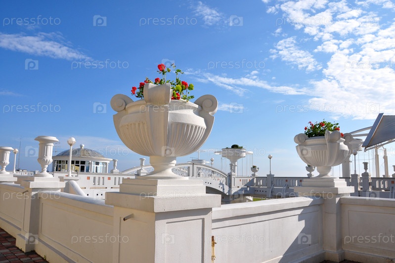 Белые каменные вазоны с цветами на фоне синего неба