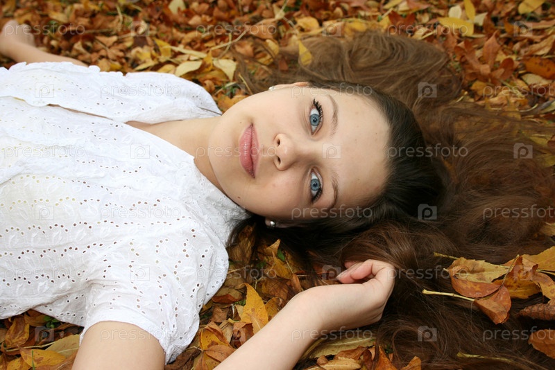 Девочка с голубыми глазами лежит на желтых листьях