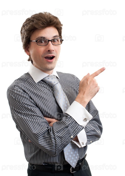 Удивленный молодой бизнесмен, указывающий на что-то пальцем