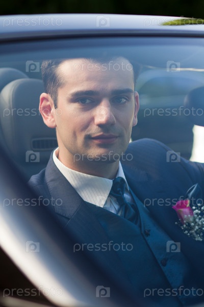 Красивый молодой жених в автомобиле