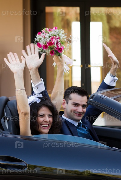 Счастливые молодожены в автомобиле