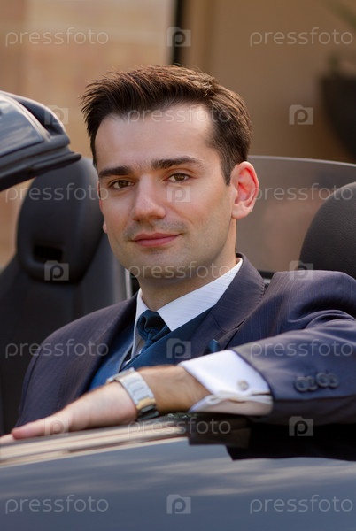 Красивый молодой жених в автомобиле