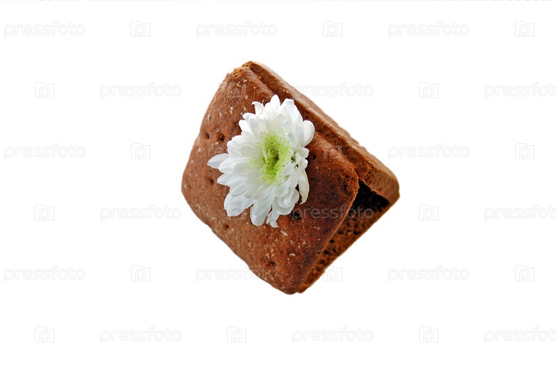 Домик из ломтиков черного хлеба с белым цветком хризантемы вместо трубы