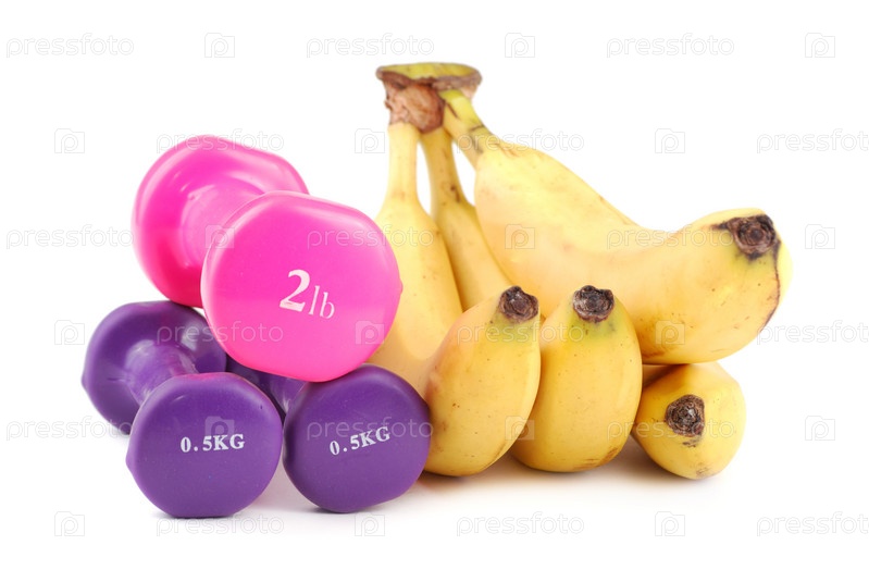 Бананы и гантели разного цвета на белом фоне