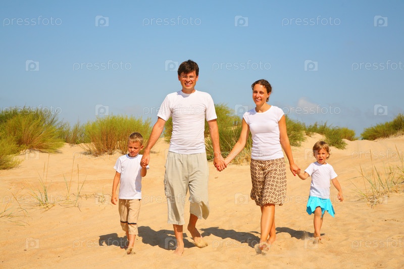 Счастливая семья ходит по песку