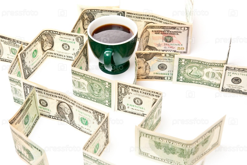 Чашка черного кофе в центре лабиринта, составленного из долларов