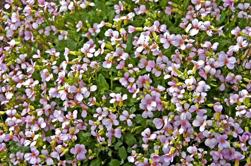 Мелкие розовые весенние цветы на фоне зеленых листьев