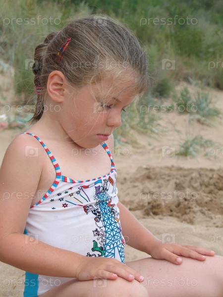 Обиженная маленькая девочка в купальнике сидит на пляже