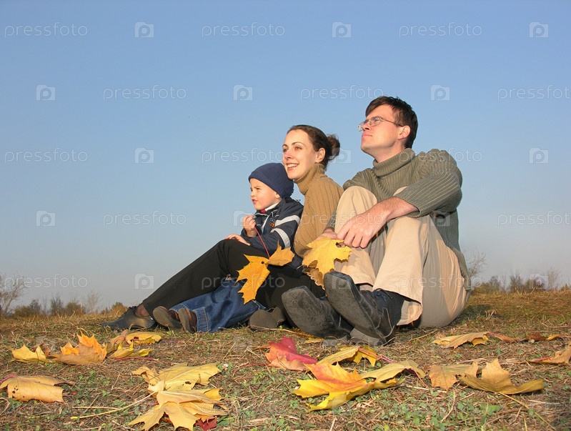 Семья сидит с осенними листьями