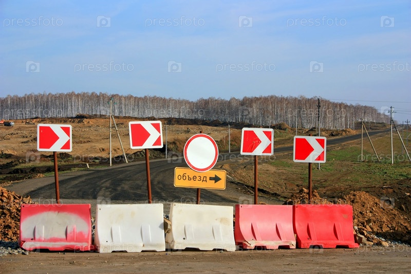 Строительство новой дороги и знак, показывающий объезд