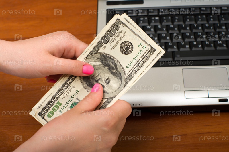 Доллары в женских руках над ноутбуком