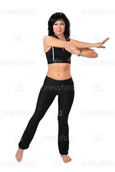 Стройная брюнетка в черном спортивном костюме на белом фоне