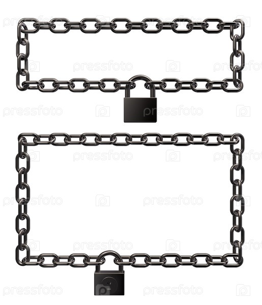 Замок в раме из металлических цепей на белом фоне - 3d иллюстрация