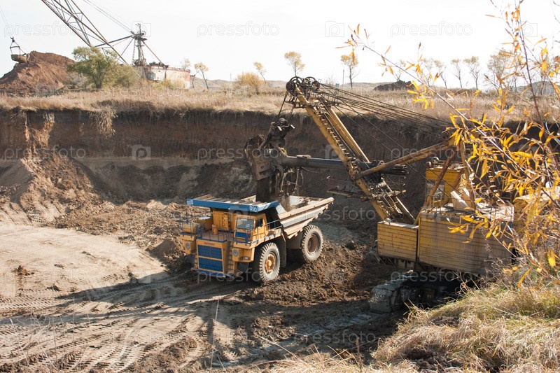 Грузовик и два экскаватора в промышленной зоне