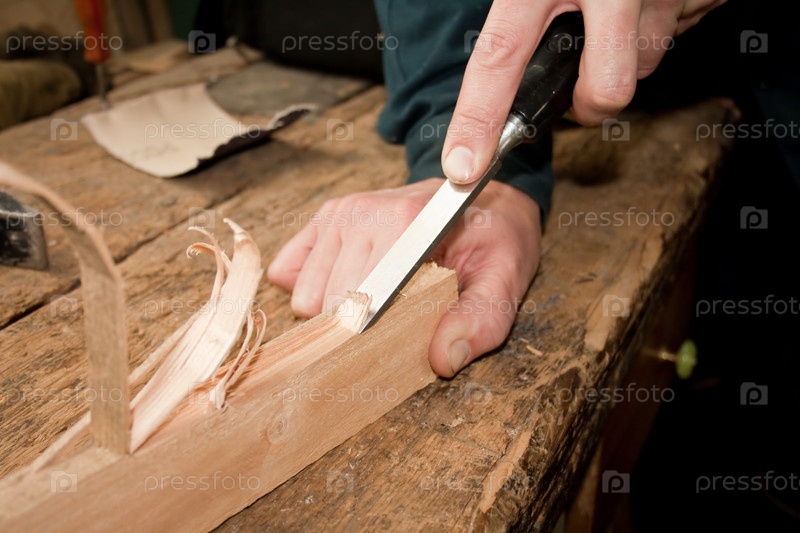 Опытный плотник работает стамеской