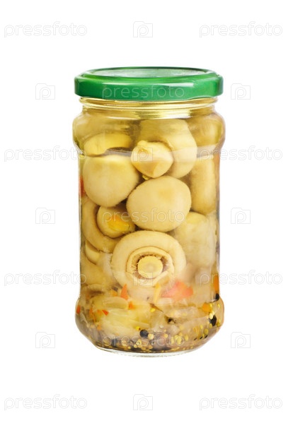 Маринованные грибы в стеклянной банке, изолированные на белом