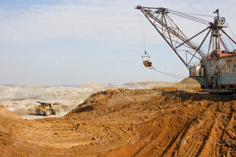 Мощный экскаватора и едущий мимо грузовик