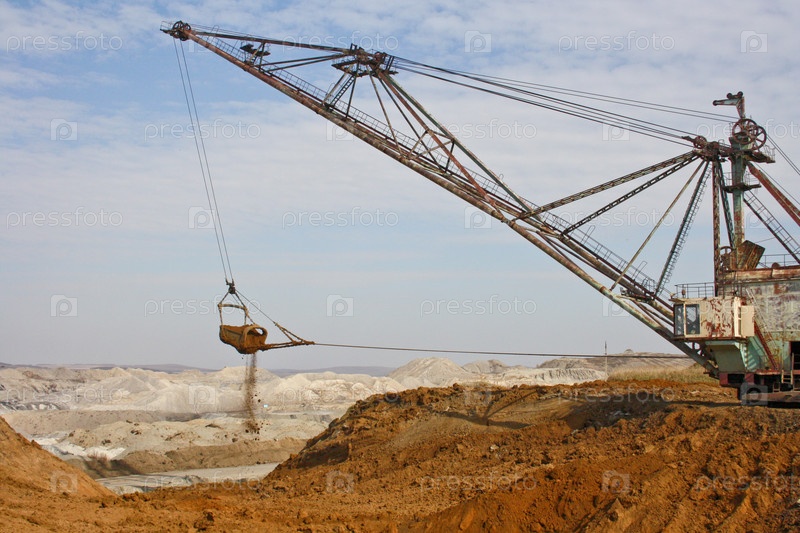 Мощный экскаватор копает яму и переносит грунт в другое место