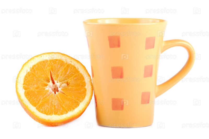Половинка апельсина и оранжевая кружка