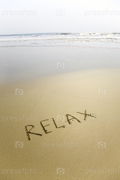 Слово 'relax' написано на песке у берега