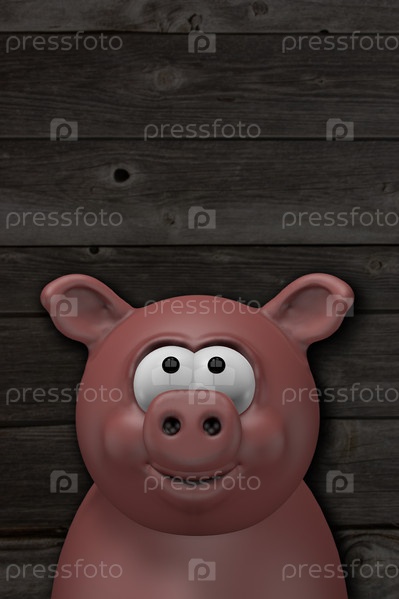 Счастливая свинья на фоне старых деревянных стен - 3d иллюстрация
