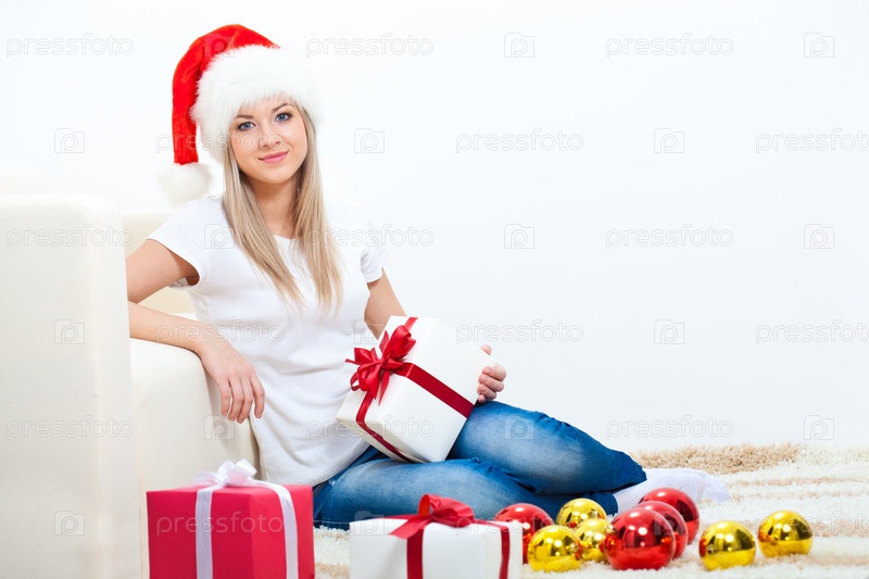Женщина в колпаке Санты у себя дома