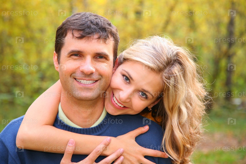 Улыбающиеся мужчина и женщина на фоне осеннего пейзажа