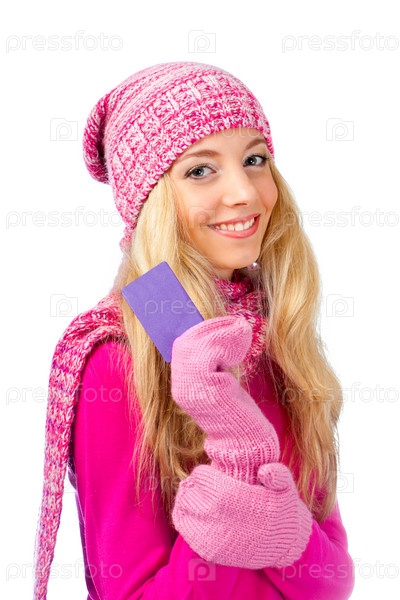 Блондинка держит визитную карточку