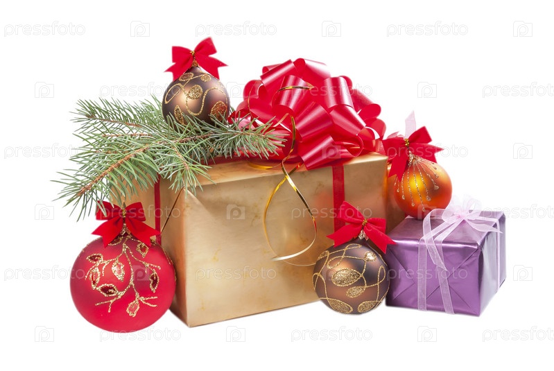 Подарки и шарики с еловыми ветками