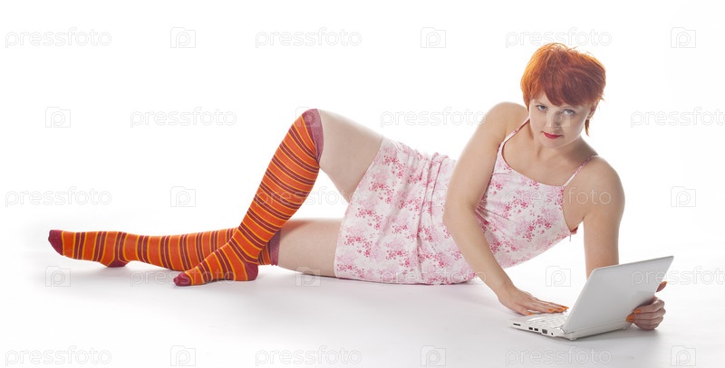 Красная девушка в полосатых носках с ноутбуком на белом фоне