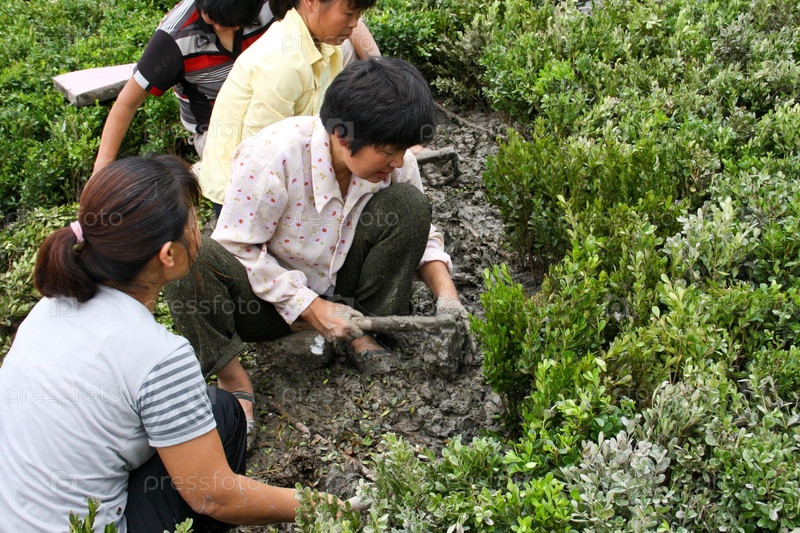 Китайские женщины делают красивый газон