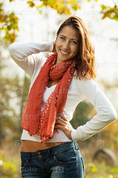 Улыбающаяся молодая женщина на природе в солнечный осенний день