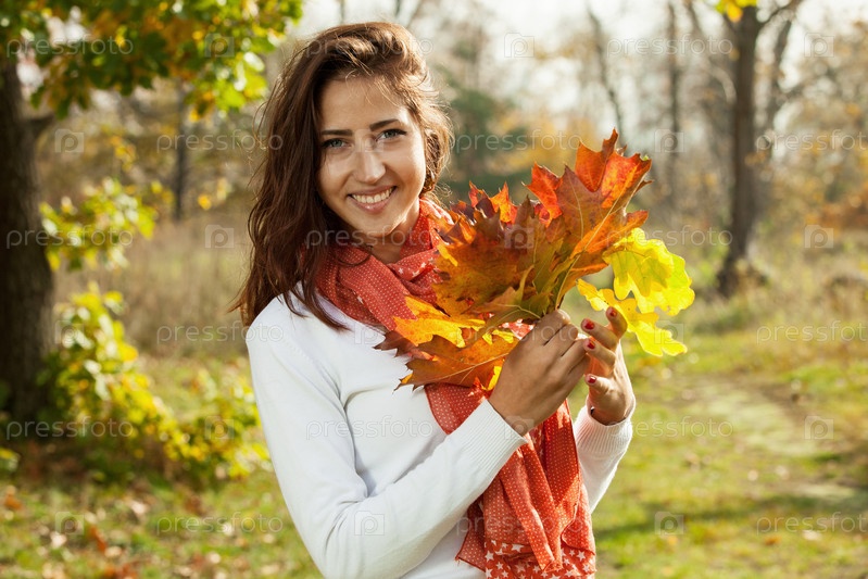 Девушка с осенними листьями в руках в солнечный день