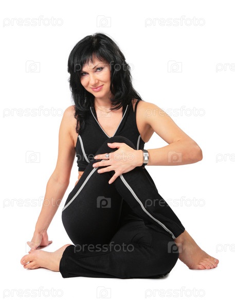 Спортивная брюнетка в черном занимается фитнесом