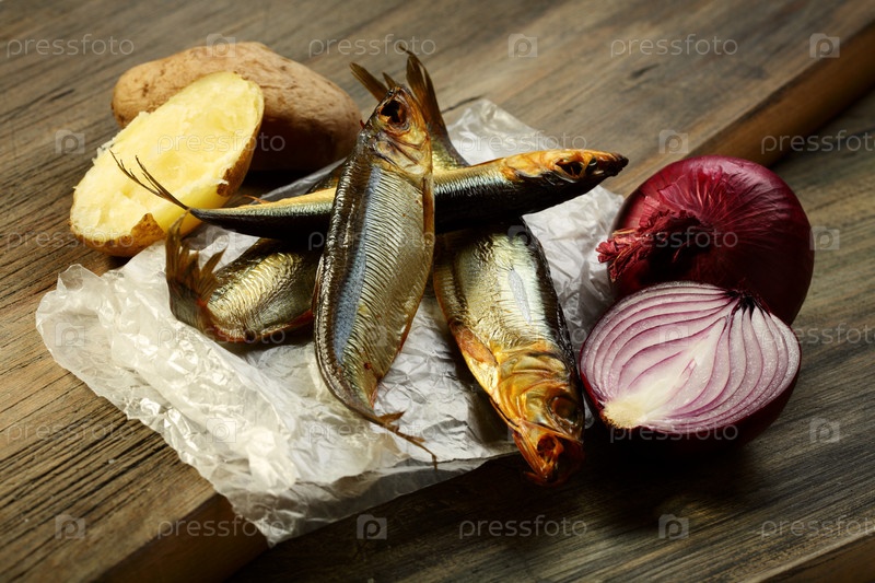 Копченая рыба, картофель и красный лук
