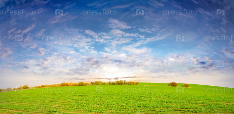 Красивая зеленая трава на поле и небесный пейзаж