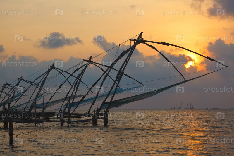 Кочи китайских рыболовных сетей на закате. Форт Котин, Кочи, Керала, Индия
