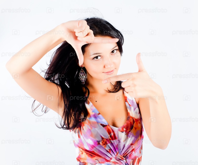 Девушка с жестоим, имитирующим фотоснимок. Фокус на пальцах