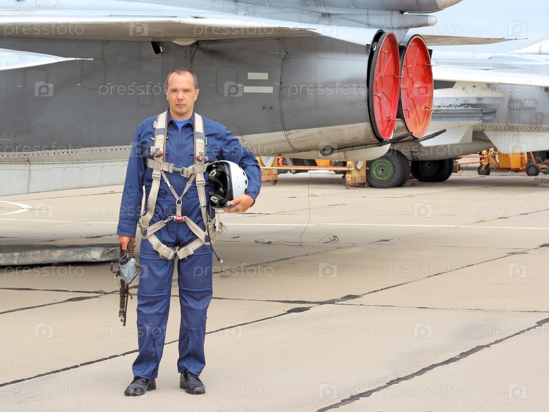 Военный летчик в шлеме возле самолета