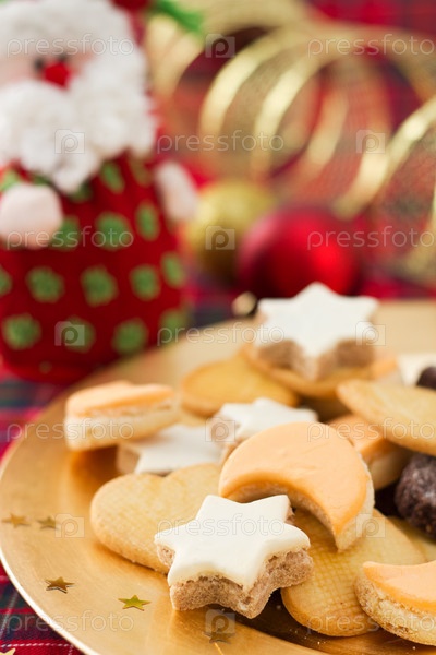 Рождественское печенье на золотой тарелке с праздничными украшениями