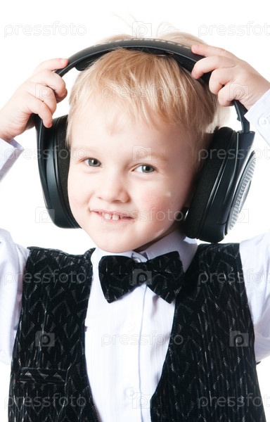 Мальчик в наушниках на белом фоне
