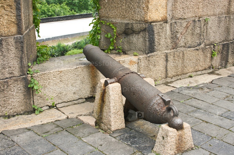 Старинная пушка на крепостной стене