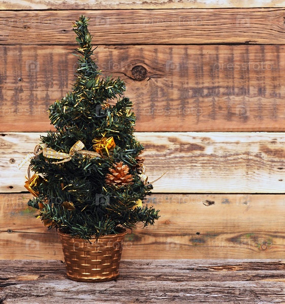 Рождественская ель с украшениями на деревянном фоне