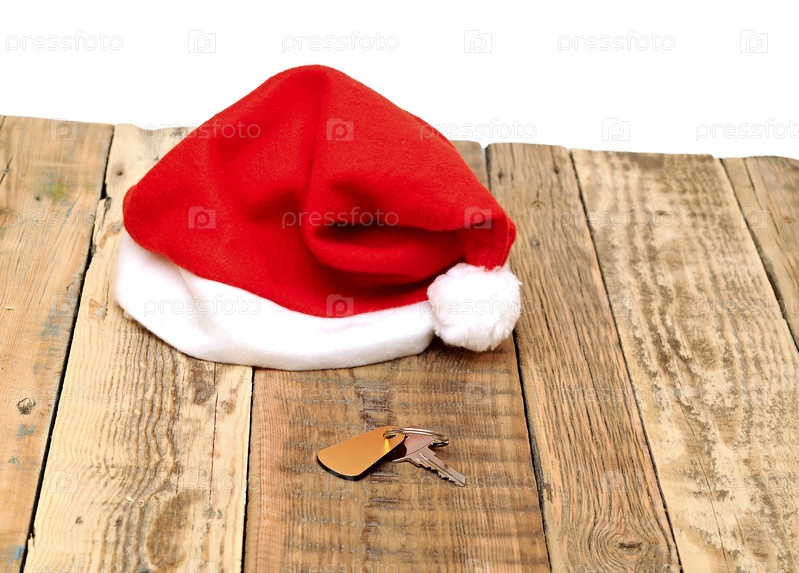 Колпак Санта-Клауса и ключ с пустой биркой на старом деревянном столе