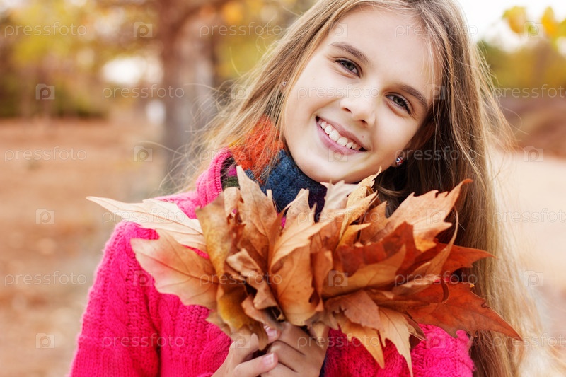 Счастливая девочка с осенними опавшими листьями