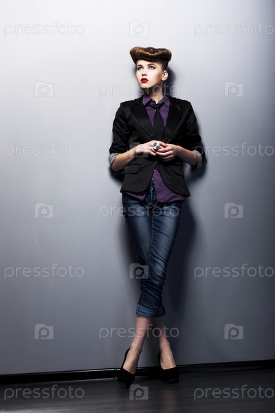 Девушка в американском стиле пин ап в старинном галстуке, рубашке и жилете